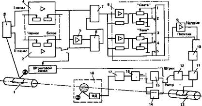 Схема нерезкого вания </ = </i + (l/i-£/*). Результирующий сигнал имеет вид, представленный на рис. 5.18, б. Из графика видно, что разность сигналов на границе светлого и темного участков увеличивается, что позволяет подчеркнуть контуры изображения и выделить его мелкие детали. Сигналы, которые получены из электронных блоков 13, 14, 19 (см. рис. 5.14), содержат информацию о цветоделенных откорректированных изображениях оригинала. Последующие электронные блоки необходимы для изменения масштаба изображе-