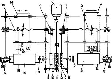 Для получения клише с точечной структурой печатающих элементов в гравирующую систему вводится периодический сигнал, частота которого задается частотой растра. Фотодатчик растра 18 расположен в переднем отсеке коробки линиатур, а сам растровый диск с двенадцатью дорожками закреплен на оси двигателя. По таблице выбирается номер дорожки растрового диска в зависимости от выбираемой линиатуры. Сигнал с выхода растрового фотодатчика 18 поступает на вход формирователя 17, который формирует прямоугольные импульсы с крутыми фронтами. На делителе 16 частота этих импульсов формируется в соотношении 1:2: 4. Далее импульсы поступают на интегратор 15, где они преобразуются в импульсы треугольной формы. Интегратор 15 включен в схему автоматической регулировки усиления (АРУ) 14. На выходе интегратора поддерживается неизменная амплитуда растровых импульсов вне зависимости от изменения амплитуды прямоугольных импульсов на его входе. Из интегратора 15 импульсы поступают в усилитель мощности растрового канала 12 и затем в растровую катушку гравирующей головки 1L С машиной поставляются три гравирующие головки одинаковой конструкции, отличающиеся только диаметром якоря. Каждая из трех головок применяется в зависимости от линиатуры гравирования и диаметра формного цилиндра. Кинематическая схема электронной гравировальной машины типа ЗЭГЦ-С. В машине заложена возможность гравирования штриховых и полутоновых клише путем смены цилиндров в диапазоне изменения масштаба от 45 до 220%. Изменение масштаба — ступенчатое, глубина гравирования — 0,07—0,30 мм, виды растра — точечный и линейный. Линиатура гравирования для полутоновых клише — 24, 28, 32, 36, 40, 45 и 52 лин/см, для штриховых клише — 79, 90, 120, 180 и 360 лин/см. Скорость гравирования — от 4,65 до 10,02 м/мин, максимальный формат клише — 350X480 мм. Годовой экономический эффект от внедрения машины типа ЭГЦ составляет около 1600 руб. Кинематическая схема машины ЗЭГЦ-С представлена на рис. 5.22. На облегченной станине закреплены две опоры и коробка линиатур. Электродвигатель 1 через червячную передачу 9 вращает формный цилиндр 6 и цилиндр оригинала 14, закрепленные между плавающими центрами 5 и центрами 7 и 13 коробки линиатур 10. В коробке линиатур расположен фотодатчик 12 растра 11. Тот же привод через храповые колеса 2, эксцентрики 8 и рычаги поворачивает на заданный угол ходовые винты 3 и 15, которые перемещают каретки 16 (с фотоголовкой) и 4 (с гравирующей головкой). Храповые механизмы обеспечивают изменение масштаба в поперечном направлении. В машине ЗЭГЦ-С