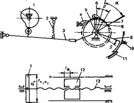 Рис. 5.22. Кинематическая схема ЗЭГЦ-С установлены два одинаковых храповых механизма для независимого привода кареток гравирующего блока и фотоголовки. Механизм такого типа, приведенный на рис. 5.23, устроен следующим образом. Каретка фотоголовки 12 (рис. 5.23) получает перемещение от ходового винта 13, связанного с храповым колесом 7. Храповик 7 поворачивается качающимся рычагом 8 при помощи собачки 6. Угол поворота храпового колеса (а—р) определяет величину шагового перемещения фотоголовки и задается установкой рычага 9 со шторкой 5, частично перекрывающей рабочую зону собачки 6 в то или иное положение. Установка производится по шкале 11, после чего рычаг 9 стопорится зажимом 10. Качающийся рычаг 8 получает движение от кулака 1 через вильчатый рычаг 3. Кинематическое замыкание кулака с роликом производится пружиной 2, а собачка 4 предуп-