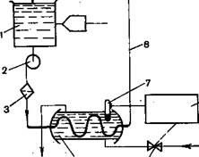 как иначе не удастся нор шается. Подобные устройства обеспечивают высокую (до 1%) стабилизацию времени обработки фотоматериала. Система циркуляции и термостатирования растворов обеспечивает непрерывное интенсивное перемешивание и фильтрацию растворов и стабильное поддержание рабочей температуры раствора по всему объему бака. На рис. 6.1 показана упрощенная функциональная схема замкнутого контура циркуляции фотообрабатывающего раствора. Принцип действия системы состоит в том, что раствор отсасывается из бака / центробежным насосом 2 и через фильтр 3 поступает в теплообменник 4 и далее по трубопроводу 8 подается снова в бак машины. Такой замкнутый цикл циркуляции растворов осуществляется в большинстве современных проявочных машин. Раствор, как правило, забирается из нижней части бака, а подается в среднюю. Для интенсификации процесса обработки фотоматериалов в системы циркуляции включаются специальные устройства, обеспечивающие равномерное и высокоэффективное воздействие рабочих растворов на обрабатываемую по- верхность пленки. Так, например, в отдельных моделях для дополнительного перемешивания и направления раствора на поверхность пленки применяют валы с лопастями, в других — пропеллерные мешалки, которые направляют поток раствора в специальные каналы, в которых перемещается фотоматериал. При этом в канале создается интенсивное движение растворов по обрабатываемой поверхности материала. Для обеспечения высокой скорости обработки фотоматериала применяют подачу раствора на поверхность затопленными струями. При циркуляции раствора по замкнутому контуру наблюдается изменение его температуры из-за потерь тепла в окружающую среду, уноса тепла пленкой, изменения температуры окружающей среды и др. Система термостатирования рабочих растворов обеспечивает непрерывный контроль температуры и поддержание ее с требуемой точностью. Система термостатирования включает нагревательные и холодильные элементы, блок контроля температуры 6 (рис. 6.1) с термодатчиком 7 и исполнительные элементы 5 (пусковые реле и электромагнитные вентили). В полиграфических проявочных машинах электронагревате Температура фиксажа поддерживается с меньшей точностью, и поэтому с целью экономии электроэнергии для его термостатирования применяют более простые системы. Наиболее простым вариантом является бак с двойным дном, через полость которого пропускается вода с необходимой температурой. В отечественных проявочных машинах, как правило, в качестве теплоносителя используется оборотная вода. В этом случае электронагреватели и змеевики охлаждения располагаются в отдельной емкости с водой. Теплообменная вода циркулирует по замкнутой системе и передает тепло рабочим растворам либо через^ стенки двойного дна, либо через теплообменник, построенный по схеме «труба в трубе». При этом в одной из них протекает вода, а в другой рабочий раствор. Датчик терморегулятора может находиться либо в баке с раствором, либо в теплообменнике.