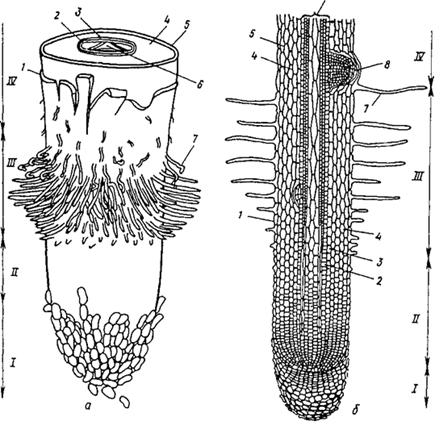 Общий вид (а) и продольный срез (б) корневого окончания (схема): / — корневой чехлик; //—зона роста, или растяжения; III— зона корневых волосков, или зона всасывания; IV— начало зоны проведения (в этой зоне также закладываются боковые корни); 7 —эпиблема; 2 — перицикл; 3 — эндодерма; 4—первичная кора; 5—экзодерма; б—осевой цилиндр; 7— корневые волоски на эпиблеме; 8— заложившийся боковой корень
