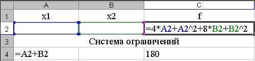 В данной модели система ограничений состоит из одного линейного уравнения и нелинейной целевой функции. 1. Заполняем ячейки на рабочем листе необходимыми переменными, целевой функцией и ограничениями: