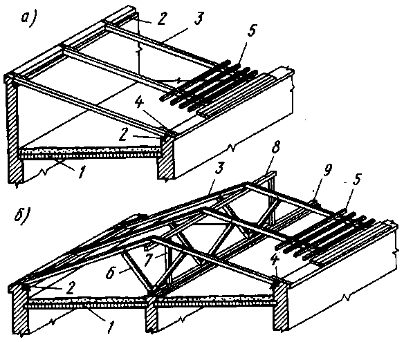 а - односкатная; б – двускатная; в – четырехскатная; г – сводчатая; д – многоскатная; е – шатровая; ж – пирамидальная; з - купольная В здании небольшой ширины часто устраивают односкатные крыши. Скат – наклонные плоскости крыши. Крышу здания со стоком воды на две противоположные стороны называют двускатной. Треугольный скат – вальма. Если скат срезает не весь торец двускатной крыши, а только верхнюю или нижнюю ее часть, то неполный торцовый скат называют полувальмой, а крышу полувальмовой. Несущими конструкции скатных крыш являются наслонные стропила или стропильные фермы, по которым делают обрешетку, являющуюся основанием для кровли. Наслонные стропила устраивают в здании при пролетах между опорами не более 6 м. Стропильные фермы применяют при больших пролетах, а также в случае отсутствия промежуточных опор. Наслонными называют стропила, основные элементы которых – стропильные ноги, имеют не менее 2 опор (рис. 2). Стропильные ноги опираются на мауэрлаты (подстропильные брусья) – горизонтальные элементы, уложенные по наружным стенам здания и предназначенные для восприятия нагрузки от концов стропильных ног. Назначение мауэрлата – равномерно распределять давление от стропил на каменную кладку. При пролете более 5 м стропильные ноги необходимо дополнительно поддерживать подкосами. На внутренние опоры укладывают лежниили прогоны, по которым через 5-6 м друг от друга устанавливают стойки (вертикальные элементы, поддерживающие коньковый прогон). Стойки и прогоны образуют опорные рамы под стропила. Часто для повышения жесткости и уменьшения сечения прогонов под ними ставят подкосы. Для той же цели применяют затяжки-ригели, связывающие стропильные ноги между собой.