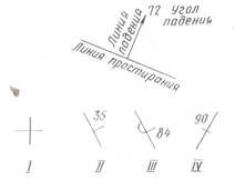 Рис. 3 Условные знаки для изображения элементов залегания на геологической карте: I - горизонтальное залегание, II - нормальное, III – перевернутое (опрокинутое), IV – вертикальное