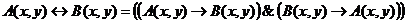 Предикаты, так же, как высказывания, принимают два значения и и л (1, 0), поэтому к ним применимы все операции логики высказываний. Рассмотрим применение операций логики высказываний к предикатам на примерах одноместных предикатов. Пусть на некотором множестве М определены два предиката Р (х) и Q (х). Определение 4. Конъюнкцией двух предикатов Р (х) и Q (х) называется новый предикат Р (х)& Q (х), который принимает значение «истина» при тех и только тех значениях Так, например, для предикатов Р (х): «х – четное число» и Q (х): «х кратно 3» конъюнкцией Р (х)& Q (х) является предикат «х – четное число и х кратно 3», то есть предикат «х делится на 6». Определение 5. Дизъюнкцией двух предикатов Р (х) и Q (х) называется новый предикат Определение 6. Отрицанием предиката Р (х) называется новый предикат Определение 7. Импликацией предикатов Р (х) и Q (х) называется новый предикат Так как при каждом фиксированном Ясно, что при выполнении логических операций над предикатами к ним применимы и равносильности алгебры логики. Пример 3. Пусть даны предикаты А (х,у) и В (х,у), определенные на множестве Решение. Так как