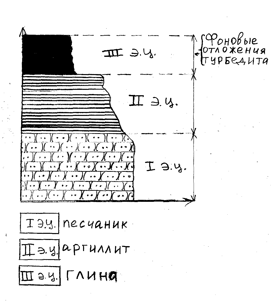Рис. 3. Строение флишевого циклита Ритмичная толща - в слоистых осадочных толщах нередко наблюдается многократная закономерная повторяемость характерных слоёв или комплексов слоёв. Это явление называется ритмичностью осадочных толщ. Отдельные повторения, взятые изолированно от смежных повторений, называются ритмами или многослоями (рис.4). Разрез ритмичной толщи был установлен на западном окончании поселкового пляжа.