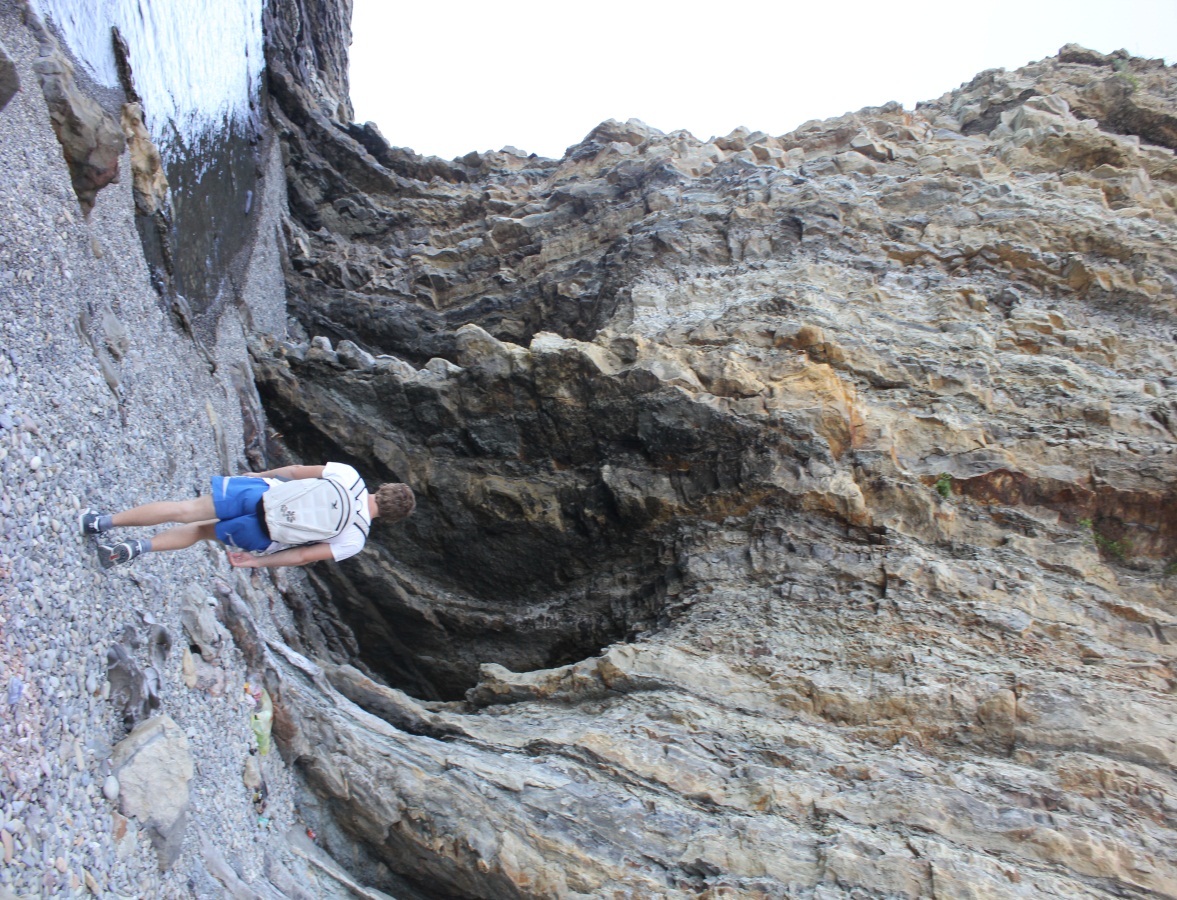 Рис.22 - Восточное побережье (Фотография:Сидоренко Е., 2012) За время практики два наших маршрута проходило по берегу Черного моря, поэтому мы смогли ознакомиться с геологической деятельностью моря, которая была представлена разрушением берега, переносом разрушенного материала и его аккумуляцией, т.е. накоплением. Разрушительное действие моря связано с движением морской воды. Наибольшее значение имеют волны, в меньшей степени - приливы и отливы. В период сильных штормов возникают огромные волны, которые, следуя друг за другом, с большой силой обрушиваются на берег и интенсивно разрушают его. Суша отступает под натиском моря, как бы срезается ими. Выделяются два типа морских берегов отличающихся друг от друга своим развитием: приглубый берег, близ которого дно моря имеет крутой уклон и преобладающая часть обломочного материала уносится на подводный склон и отмелый берег с пологим откосом и движением большой части обломочного материала в сторону берега (прил.17). В нашем случае наблюдается приглубый берег и наибольшая разрушительная деятельность моря проявляется именно у этих берегов. Границы береговой зоны зависят от факторов: морского волнения, волновых течений и приливно-отливных явлений. Приливы и отливы - это периодическое колебание уровня моря, которое возникают благодаря притяжению Луны и Солнца. В нашем случае их действия незначительные. Они в большой степени производят размыв дна моря, чем разрушение берега. В формировании морских берегов принимают участие также некоторые организации, т.е. антропогенный фактор. Важным условием развитием берега является также тектонические движения земной коры и геологическое строение прибрежной суши и подводного берегового склона (Короновский, 2002). Рассмотрим некоторые факторы разрушения берега. Разрушение берегов морем производится в результате: гидравлического удара самой воды; ударов многочисленными обломками горных пород, захватываемыми сильными волнами; химического действия воды. Химическое воздействие морской воды осуществляется при помощи содержащихся в ней солей и других активных веществ лишь там, где берега сложены такими лёгкорастворимыми породами как известняк, доломит и т.д. В нашем случае береговые обрывы сложены флишем, представленным в основном устойчивыми к химическому разрушению известковистыми песчаниками, алевролитами и аргиллитами. Поэтому этот фактор мы не будем подробно рассматривать. Процесс срезания берега происходит не бесконечно, со временем, вследствие увеличения ширины террас, энергия волн, подходящих к подножью отступившего берегового обрыва, понижается. Быстрота разрушения берегов и скорость их отступления не одинаковы в различных районах и зависят от ряда факторов. Скорость размыва значительно уменьшается там, где хорошо развит пляж. Скорость разрушения и отступания берега в Туапсинском районе составляет несколько метров в год (Зенкович, 1958).