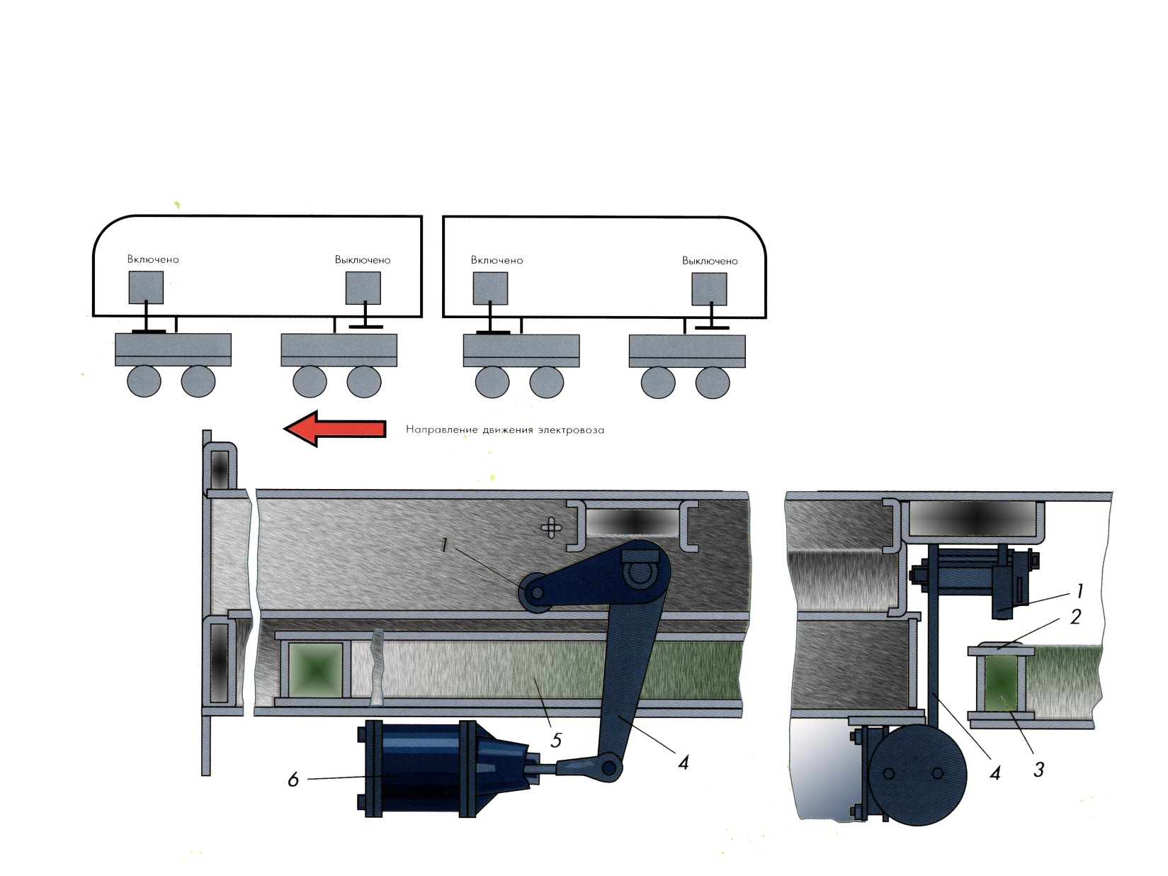 УСТРОЙСТВО: состоит из воздушного цилиндра (подобен тормозному цилиндру) 6, который крепится к буферному брусу рамы кузова на специальном кронштейне и Г - образного рычага 4, на конце которого установлен ролик 1. Конец вертикального плеча рычага шарнирно соединяется со штоком поршня. Рычаг имеет возвратную пружину. Сжатый воздух в цилиндр ПРУ первой по ходу тележки подается со стороны кабины с помощью электропневматического клапана 262, а в цилиндр второй тележки – со стороны переходной площадки с помощью электропневматического клапана 263. Управление катушками вентилей 262 и 263 автоматическое, в зависимости от положения реверсивного и блокировочного переключателя (БП). При тяге, по направлению движения, на каждой секции включаются передние ПРУ, а при торможении – задние ПРУ. Вентиляторы