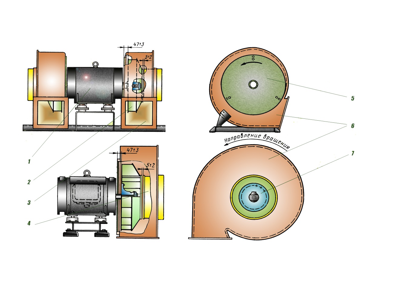 НАЗНАЧЕНИЕ: служат для вентиляции кузова и охлаждения воздухом оборудования. УСТРОЙСТВО: на ВЛ-80с и ЭП1М вентиляторы подобные и состоят из рабочего колеса и кожуха. Рабочее колесо 2 состоит из ступицы 6, к которой приклепан основной вертикальный диск и наклонный диск с приваренными изогнутыми лопатками. Рабочее колесо устанавливается на вал ротора асинхронного двигателя 1 и крепится на нем болтом, который вворачивается в отверстие вала ротора и шплинтуется шайбой, которая отгибается и прижимается к грани болта. Кожух 6изготовлен из пластика, имеет форму улитки. На боковинах кожуха с одной стороны - отверстие большого диаметра, через которое проходит рабочее колесо, оно закрывается крышкой 5 с войлочным уплотнением. Крышка крепится к подшипниковому щиту асинхронного двигателя. С другой стороны кожуха расположено отверстие меньшего диаметра, в который вставляется и крепится всасывающий патрубок 4. На кожухе имеются нагнетательное отверстие 3.