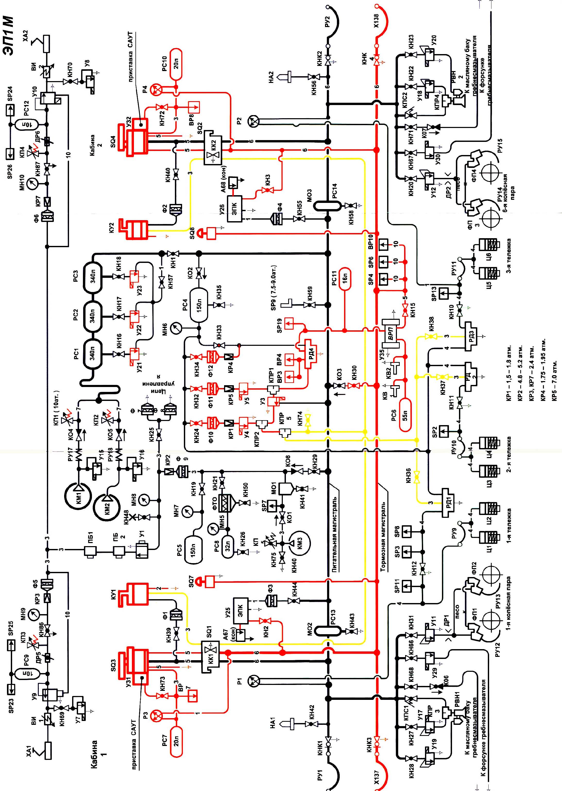 УСТРОЙСТВО на ЭП1М: схема включает в себя систему смазывания гребней 1-й и 6-й колесных пар. Сжатый воздух в систему поступает через электромагнитные вентили У29 и УЗО. В работу вступает гребнесмазыватель первый по ходу движения электровоза колесной пары. Краны КН66, КН67 и КН68, КН71 постоянно открыты и перекрываются только в случае выхода из строя гребнесмазывателей. Звуковыми сигналами являются тифон и свисток РВН1 (РВН2), установленные на едином кронштейне. Тифон имеет дистанционное электропневматическое управление клапанами У17 (У18) и непосредственное пневматическое управление клапанами КПС1 (КПС2), свисток - электропневматическое управление клапанами У19 (У20). При выходе из строя электропневматических клапанов У17, У18, У19, У20 их отключают соответствующими кранами КН27, КН22, КН28, КН23. Сжатый воздух, поступающий в резервуар РС8 главного воздушного выключателя из питательной магистрали, дополнительно очищен фильтром с металлокерамической вставкой ФТО. Разобщительный кран КН21 постоянно открыт и опломбирован в этом положении. Перекрывают кран КН21 только в случае выхода из строя выключателя. Перед этим выключатель должен быть переведен в положение «выключен». Для спуска конденсата из резервуара РС8 и фильтра ФТО установлены спускные краны КН26 и КН50. Сжатый воздух, питающий аппараты цепей управления и токоприемника, очищается фильтром Ф9 и поступает в редуктор КР2, где давление воздуха понижается до 5,0±0,2 кгс/см2. Далее воздух заполняет цепи блокирования задвижных штор высоковольтных камер, токоприемника и электропневматических контакторов. Для обеспечения подъема токоприемника давление сжатого воздуха понижается редуктором КРЗ (КР7) до 2,4 кгс/см2. Управление подъемом и опусканием токоприемника осуществляется клапаном У9 (У10). С целью обеспечения устойчивой работы токоприемника установлен резервуар РС9 (PC12) объемом 10 литров и дроссельное устройство ДР5 (ДР6). Клапан предохранительный КПЗ (КП4) защищает токоприемник от перегрузок при его перемещениях или разрегулировке редуктора КРЗ (КР7). Воздухопровод ВИ1 (ВИ2) - изоляционное устройство, разъединяющее токоприемник от земли. Материал воздухопровода - фторопласт. Для исключения возможности входа в высоковольтную камеру без опускания токоприемника установлен вентиль защиты. Вентиль не открывает выход сжатого воздуха в атмосферу, а следовательно и не разблокирует высоковольтную камеру, если хотя бы одна из его катушек остается под напряжением. Для стабилизации величины нажатия полоза токоприемника на контактный провод, при прохождении участков с меняющейся высотой контактного провода, в системе питания токоприемника установлены сигнализаторы давления SP23 (SP24) и SP25 (SP26) и устройство пневматическое У7 (У8). После подачи напряжения на клапан токоприемника У9 (У 10) воздух из буферного резервуара РС9 (PC 12) и через калибровочный клапан ДР5 (ДР6) со стороны редуктора КРЗ (КР7) поступает в баллон токоприемника. При достижении необходимого давления в баллоне токоприемник поднимается. Время подъема токоприемника регулируется с помощью клапана ДР5 (ДР6). Контакт сигнализатора давления SP23 (SP24) разомкнут, при этом устройство пневматическое У7 (У8) закрыто. При движении полоза токоприемника вниз давление в системе нарастает и при достижении 2,5 кгс/см сигнализатор давления SP23 (SP24) собирает цепь подачи н