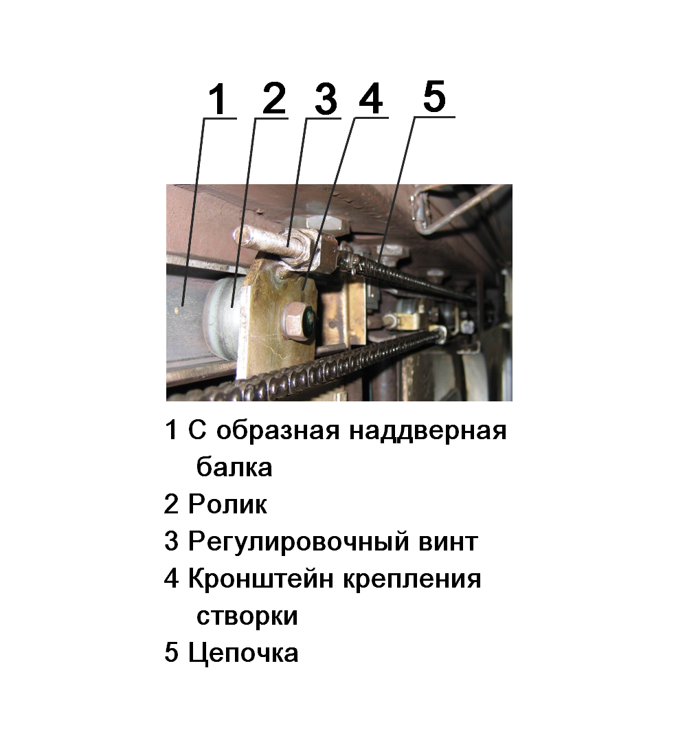 К планке болтами крепится щёчка7, которая в свою очередь прикреплена к створке двери болтами. Створки приводятся в действие на закрытие или открытие пневматическим цилиндром, связанным с одной из створок дверного проема. Усилие на вторую створку дверного проема передается от первой при помощи двух цепей (Рис11.) Цепи заведены через звездочки, установленные на арочных балках. Натяжение цепей регулируется натяжными винтами. Рис.10.Шариковое подвешивание