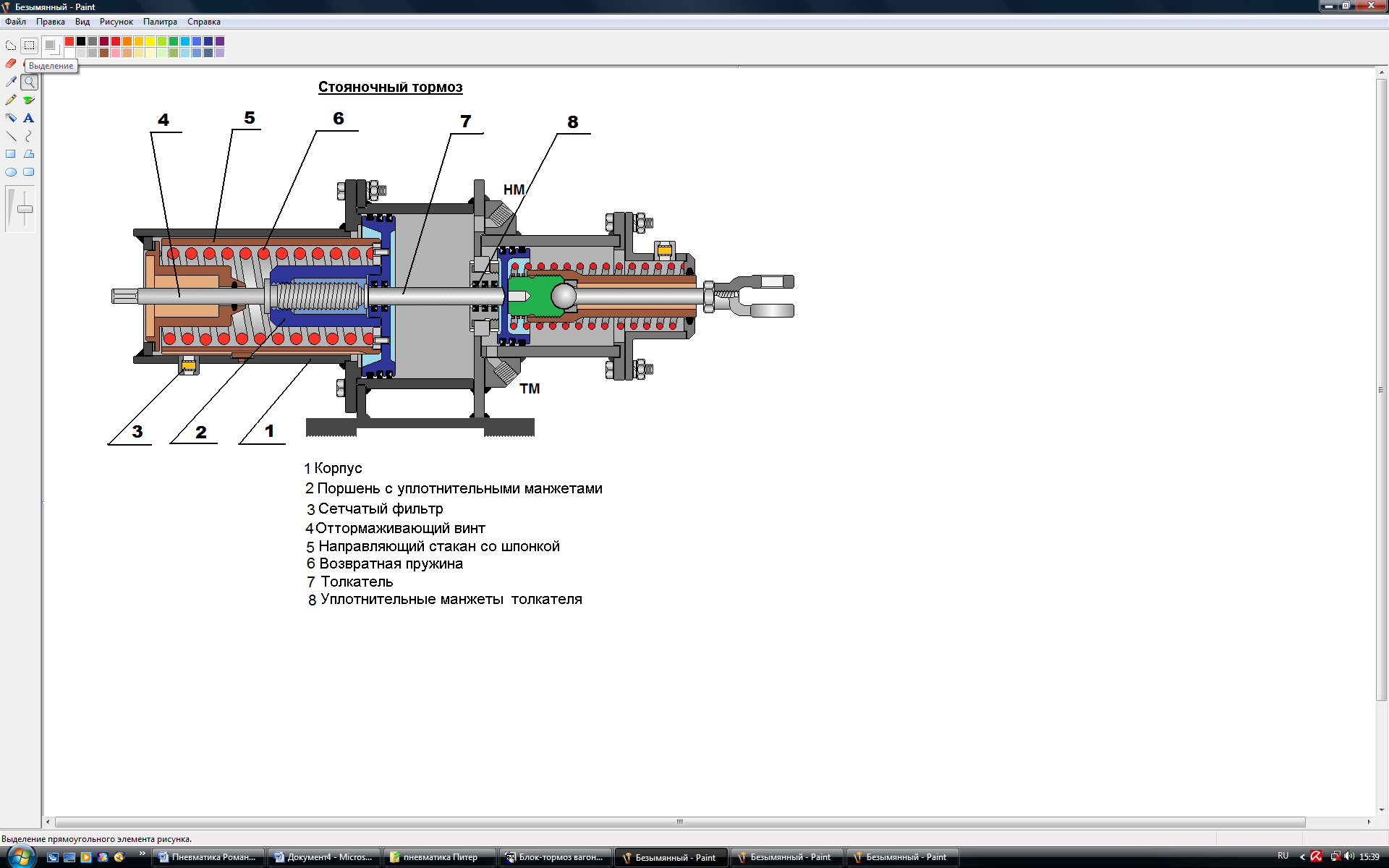· камера тормозного цилиндра (3) · камера стояночного тормоза · Камеры разделены фланцем с отверстием под промежуточный шток, уплотненным манжетами. · Составные элементы стояночного тормоза: · цилиндр стояночного тормоза · корпус пружинного аккумулятора, который крепится к цилиндру четырьмя болтами через уплотнительную прокладку · поршень стояночного тормоза с уплотнительными манжетами и кольцом. К поршню приварена втулка, которая имеет резьбу для оттормаживающего винта · пружина стояночного тормоза с усилием распрямления 1000 кг · стакан, имеющий продольную проточку для его движения вдоль корпуса · дно стакана · оттормаживающий винт · промежуточный шток (толкатель) · обойма с тремя уплотнительными манжетами, которые отделяют камеру · стояночного тормоза от тормозного цилиндра