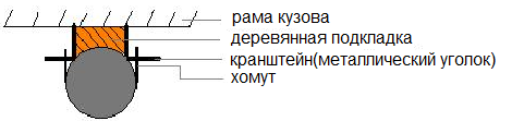 Рис.12. Крепление резервуара Применение деревянных подкладок обусловлено, прежде всего, хорошей изоляционной способностью дерева. В случае непреднамеренного переброса низковольтного напряжения на трубопроводы магистрали управления, а через них на все трубопроводы, воздушные резервуары также окажутся под напряжением. Резервуары, благодаря своему большому объему, начнут выступать в роли конденсаторов электрической энергии, что может вызвать пробой, т.е. появление дугового искрообразования между резервуаром и заземленной рамой кузова. Структура металла стенки резервуара будет нарушена. Переброс напряжения может возникнуть из-за неисправности электромагнитных вентилей цепи управления и разрушения орешковых изоляторов.