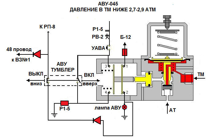 В случае понижения давления воздуха в тормозной магистрали до уровня 2,7 – 2,9 атм. давление так же понижается в камере под диафрагмой АВУ-045, так как она сообщается с тормозной магистралью. При этом, нагрузочная пружина преодолевает уменьшившееся усилие сжатого воздуха снизу на диафрагму и прогибает ее вниз. Усилием диафрагмы сверху, перемещается вниз полый толкатель. Внутреннее седло атмосферного клапана закрывается, а внешнее открывается, сообщая с атмосферой поршневую камеру. Так как поршневая камера сообщилась с атмосферой, поршень, усилием своей пружины перемещается вправо и его воздействие на толкатель контактной группы пропадает. Подвижные контакты, так же, под воздействием своей пружины перемещаются вправо. Контакты №3 и №4 (схема управления) размыкаются, а контакты №1 и №2 замыкаются, включая ВЗ №1 на всем составе.