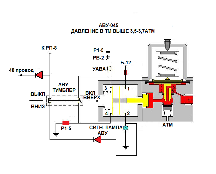 Перед началом проверки, зарядив ТМ до 5 ат., необходимо перекрыть концевые краны ТМ между первым и вторым вагоном. После этого, при помощи крана машиниста, снизить давление в ТМ головного вагона до 2.7 – 2.9 ат. и проконтролировать срабатывание АВУ-045 по загоранию лампы АВУ-045 на пульте управления. После чего проверить включение АВУ-045 по наличию давления от ВЗ №1 в остальной части поезда при нормальном давлении в ТМ. Далее восстановить концевые краны и проверить аналогичным способом включение АВУ-045 из хвостового вагона.