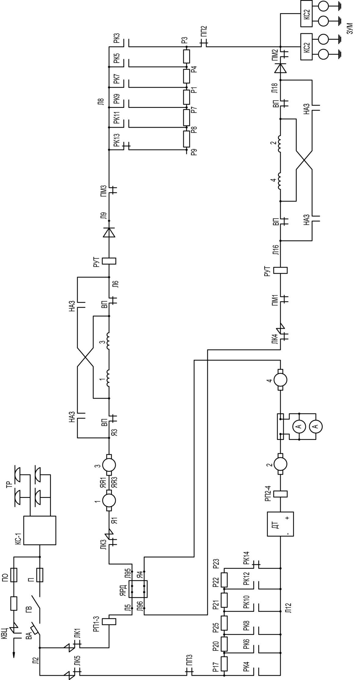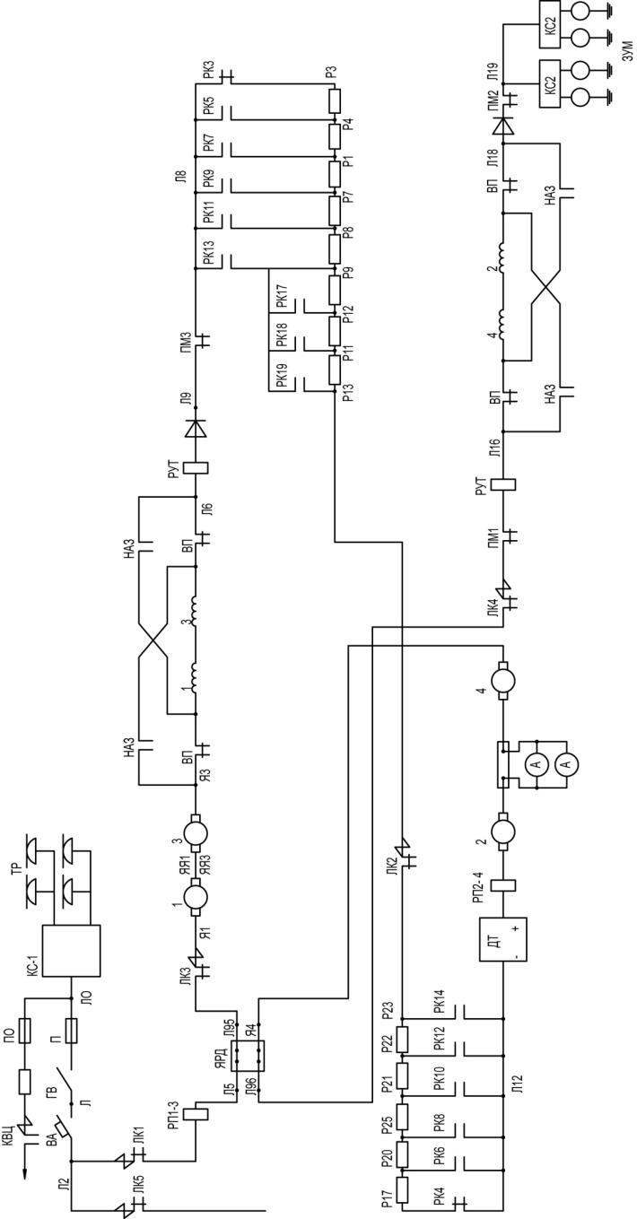 ЛК5, ПП3, РК4, ПР2-4, Я2, шунт амперметра, Я4, ДР2, ДР1, ЛК4,ПМ1, РУТ, ВП, обмотки возбуждения;4-го и 2-го двигателей, ВП, диод, ПМ2, КС2, ЗУМ, «земля».