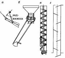 Рис.9.5. Схемы самотечных устройств а) спусковой лоток корытообразной формы; б) спускные трубы (для перемещения сыпучих грузов и особенно пылящих материалов); в) винтовые спуски (для спускания штучных грузов); г) каскадные спуски (если для спуска сыпучих материалов требуется ограниченная скорость падения) Производительность спусковых устройств зависит от коэффициента заполнения ε = 0,4…0,8, скорости движения материала по желобу, сил трения о желоб.