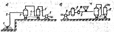 Рис.9.6. Схема пневмотранспортных установок: а — всасывающая; б — нагнетательная; 1 – насадка заборная; 2, 4 – трукбопроводы; 5 – фильтр; 6 – вакуум-насос; 7 – шлюзовый затвор; 8 – компрессор; 9 – воздухо-сборник; 10 – влагоотделитель; 11 – питатель.