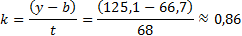 и указывает, что эту зависимость можно выразить формулой. Проверьте это. Применение метода наименьших квадратов действительно приводит к указанной формуле при тех округлениях значений коэффициентов, которые в ней приведены. Однако следует заметить, что точности данных верхней строки грубые, они не согласованы с данными нижней строки, поэтому погрешности в коэффициентах указанной формулы занижены. Теперь прикинем результат простім рас четом. Поскольку в рассматриваемой задаче зависимость между переменными имеет вид y =kt+b,то при t=0 на основании таблицы сразу оцениваем b=66,7