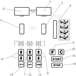Рис.3 1. Индикатор положения дисбаланса внутренней стороны. 2. Индикатор положения дисбаланса внешней стороны. 3. Дисплей значения дисбаланса внешней стороны. 4. Индикаторы, показывающие выбранную программу балансировки. 5. Дисплей значения дисбаланса внутренней стороны. 6. Кнопка ввода параметра РАСТОЯНИЕ 7. Кнопка ввода параметра ШИРИНА 8. Кнопка ввода параметра ДИАМЕТР 9. Кнопка пересчёта 10. Кнопка аварийной остановки 11. Кнопка запуска цикла 12. Кнопка оптимизации дисбаланса 13. Кнопка отмены 14. Кнопка выбора типа балансировки 15. Кнопка для выбора единиц измерения грамм/унция, мм/дюйм; самокалибровка