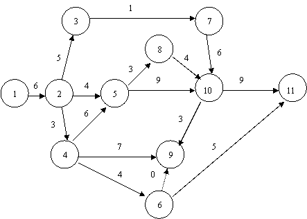 Получим сетевую модель, аналогичную рассмотренной в п. 5.2.: Получим сетевую модель, аналогичную рассмотренной в п. 5.2.: Таким образом, ход расчета характеристик модели остается аналогичен рассмотренному ранее. Напомним, что критическим является путь: Lкр=(1,2,4,5,10,11), а его продолжительность равна tкр=tож=33 дня. Дисперсия критического пути составляет: S2Kp=S2(l,2)+S2(2,4)+S2(4,5)+S2(5,10)+S2(10,M)=0,25+1,00+0,25+1,00+0,25=2,75. Для использования формулы показателя дисперсии необходимо иметь среднее квадратическое отклонение, вычисляемое путем извлечения из значения дисперсии квадратного корня, т. е. SKp=1,66. Тогда имеем: Р(tкр<35)=0,5+0,5Ф{(35-33)1,66}=0.5+0.5Ф(1,2)=0,5+0,5*0,77=0,885 Р(tкр<30)=0,5+0,5Ф{(30-33)/1,66}=0,5-0,5Ф(1,8)=0,5-0,5•0,95=0,035. Таким образом, вероятность того, что весь комплекс работ будет выполнен не более чем за 35 дней, составляет 88,5%, в то время как вероятность его выполнения за 30 дней — всего 3,5%. Для решения второй (по существу обратной) задачи прежде всего в табл. 5.2. найдем значение аргумента z, которое соответствует заданной вероятности 95%. В графе Ф(z) наиболее близкое значение (0,9545•100%) к ней соответствует z =1,9. В этой связи в формуле будем использовать именно это (не совсем точное) значение. Тогда получим: Т=tож(Lкр)+z-SKp=33+1,9×1,66=36,2 дн. Следовательно, максимальный срок выполнения всего комплекса работ при заданном уровне вероятности р=95% составляет 36,2 дня.