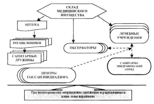 В условиях карантина санитарные дружины работают под руководством врачей поликлиник. За одной санитарной дружиной закрепляется для постоянного обслуживания территория с населением 1500 человек. Все санитарные дружины, работающие на врачебных участках данного поликлинического учреждения, пополняют израсходованное в ходе работы имущество в соответствующем поликлиническом учреждении. За поликлиническим учреждением или группой их закрепляется в аптеку откуда поликлиники получают необходимое медицинское имущество. Кроме того, аптеки должны обеспечивать медицинским имуществом об серваторы, организуемые в зоне карантина. Бактериальными препаратами обсерваторы, поликлинические и лечебные учреждения обеспечиваются через центр государственного санитарно-эпидемиологического надзора или санитарно-эпидемический отряд. При наличии в зоне карантина склада медицинского имущества, он обеспечивает медицинским имуществом аптеки и лечебные учреждения, развернутые в зоне карантина. При этом начальник медицинской службы гражданской обороны, руководящий работой по локализации и ликвидации очага бактериологического поражения, должен принять меры к наиболее полному использованию всех средств, имеющихся в зоне карантина, и может просить помощь из … только в тех случаях, когда они полностью исчерпаны.