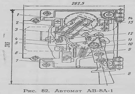 Устройство и принцип работы АВ аналогичны устройству и принципу работы электромагнитных контакторов. Включается рукояткой 8, держатель подвижного контакта 12, отключающая пружина 9, защелка рукоятки 11, ток идет от зажима 7, через замкнутые контакты 4 и 5, гибкий шунт, силовую катушку 1 к зажиму 13. Для автоматического размыкания э/ц выключатель снабжен эл.магн. устройством, состоящим из сердечника, якоря 14, скобы и силовой катушки 1, намотанной на ребро из полосовой меди. Якорь шарнирно закреплен на скобе, соприкасающейся с сердечником. Если ток превысит уставку выключателя то эл.магн. сила создаваемая катушкой преодолеет силу пружины 9 и притянет якорь к сердечнику. При перемещении якоря по направлению к сердечнику его упор отведет защелку 11 и контакты выключателя под действием отключающей пружины 9 разомкнутся, разрывая э/ц. Ток уставки АВ регулируют изменением натяжения пружины 9. Тех.данные: Ном.напр. 750В Ток уставки 120А Нажатие контактное 90- 140 Н (9- 14 кгс)