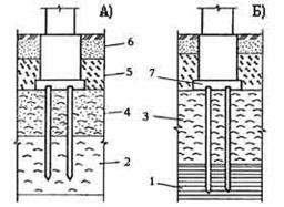 Свайные фундаменты состоят из отдельных свай, объединенных сверху бетонной или железобетонной плитой или балкой, называемой ростверком. Свайные фундаменты устраивают в случаях, когда необходимо передать на слабый грунт значительные нагрузки. А) - висячие сваи; Деревянные сваи дешевы, но недолговечны, поскольку они быстро загнивают находясь в грунте с пременной влажностью. Верхние окончания (оголовки) сваи заделывают в монолитный ростверк-цоколь.