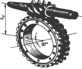 Червячная передача применяется для передачи вращения от одного вала к другому, когда оси валов перекрещиваются. Угол перекрещивания в большинстве случаев равен 90º. Наиболее распространенная червячная передача (рис. 2.10) состоит из так называемого архимедова червяка, т.е. винта, имеющего трапецеидальную резьбу с углом профиля в осевом сечении, равным двойному углу зацепления (2 α = 40°), и червячного колеса.