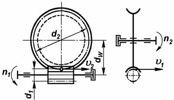 Рис. 2.10. Червячная передача Геометрия червячных передач. В червячной передаче, так же как и в зубчатой, различают диаметры начальных и делительных цилиндров (рис. 2.11): dw1, dw2 – начальные диаметры червяка и колеса; d1 , d2 – делительные диаметры червяка и колеса. В передачах без смещения dw1 = d1, dw2 = d2. Точка касания начальных цилиндров является полюсом зацепления. Червяки различают по следующим признакам: по форме поверхности, на которой образуется резьба, – цилиндрические (рис. 2.12, а) и глобоидные (рис. 2.12, б); по форме профиля резьбы – архимедовы и эвольвентные цилиндрические червяки. Архимедов червяк имеет трапецеидальный профиль резьбы в осевом сечении, в торцевом сечении витки резьбы очерчены архимедовой спиралью.