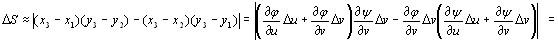 Рассмотрим в плоскости Оuv прямоугольную площадку ΔS΄, ограниченную прямыми u = const, u+Δu = const, v = const и v+Δv = const. Ей будет соответствовать криволинейная площадка ΔS в плоскости Оху (рис.4). Площади рассматриваемых площадок тоже будем обозначать ΔS΄ и ΔS. При этом ΔS΄ = Δu Δv. Найдем площадь ΔS. Обозначим вершины этого криволинейного четырехугольника Р1, Р2, Р3, Р4, где P1(x1, y1), x1 = φ(u, v), y1 = ψ(u, v); P2(x2, y2), x2 = φ(u+Δu, v), y2 = ψ(u+Δu, v); P3(x3, y3), x3 = φ(u+Δu, v+Δv), y3 = ψ(u+Δu, v+Δv); P4(x4, y4), x4 = φ(u, v+Δv), y4 = ψ(u, v+Δv). Заменим малые приращения Δu и Δv соответствующими дифференциалами. Тогда