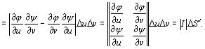 то есть модуль якобиана есть предел отношения площадей бесконечно малых площадок ΔS и ΔS΄. Замечание. Аналогичным образом можно определить понятие якобиана и его геометрический смысл для п-мерного пространства: если x1 = φ1(u1, u2,…,un), x2 = φ2(u1, u2,…,un),…, xn = φ(u1, u2,…, un), то