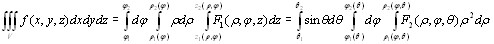 Тогда формулы перехода к цилиндрическим или сферическим координатам в тройном интеграле будут выглядеть так: (9.15)
