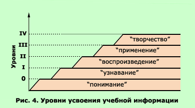 Сходные уровни усвоения знаний предлагаются и В.П. Беспалько. Разграничивая репродуктивный и продуктивный виды деятельности и рассматривая их структуру с точки зрения самостоятельности выполнения, ученый выделил следующие уровни усвоения учебной информации (Беспалько В.П., 1989) (см. рис. 4):