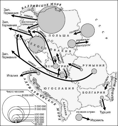 Зарубежная Европа со времен Великих географических открытий была главным в мире регионом оттока населения в заокеанские страны. Только за столетие с 1815 по 1914 г. «чистая» эмиграция из нее составила 35–40 млн человек. При этом в первой половине XIX в. среди эмигрантов преобладали жители Великобритании, Ирландии, Франции, Германии, Италии, Скандинавских и Пиренейских стран, а во второй его половине центр тяжести процесса сместился к востоку. Это была так называемая новая эмиграция – из Австро-Венгрии, Балканских стран, России. Она продолжалась и в межвоенный период. Вторая мировая война и связанные с нею изменения в политическом строе многих государств и в их границах привели прежде всего к массовым перемещениям населения между самими европейскими странами. В первую очередь это коснулось Восточной Европы (рис. 13). Как нетрудно заметить, наиболее многолюдные внешние миграции в субрегионе были связаны с массовым вселением немцев в Германию из других стран. Из них на территории Западной Германии осело 7,4 млн, Восточной – 4,3 млн человек. Для Западной Европы в первый послевоенный период наиболее характерной была массовая репатриация людей из бывших колоний Великобритании, Франции, Нидерландов, Бельгии. Например, из Алжира во Францию возвратилось не менее 1 млн французов, из Индонезии в Нидерланды -300 тыс. голландцев. Однако до середины 1950-х гг. Западная Европа имела еще отрицательное сальдо миграций, т. е. эмиграция превосходила иммиграцию. В дальнейшем, однако, положение стало быстро изменяться, и зарубежная Европа превратилась в крупнейший в мире рынок притяжения рабочей силы. Так, в 1950 г. число иностранцев в Западной Европе[10] составляло 5,1 млн человек (1,3 % от всего населения), к 1970 г. оно увеличилось до 10,2 млн (2,2 %), к 1980 г. – до 15 млн (3,1 %), а к 1990 г. – до 16,6 млн (4 %). В конце 1990-х гг. численность иностранцев только в странах ЕС, по некоторым данным, достигла 20 млн человек, а доля Европы в общем объеме мировых международных миграций увеличилась до 20 %. Разумеется, в это число входят и мигранты по политическим и иным причинам, но основную массу пришлых людей составляли и составляют именно трудовые мигранты.