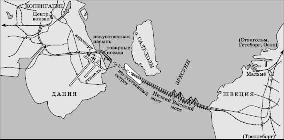 Рис. 32. Трансъевропейская сеть высокоскоростных железнодорожных магистралей в перспективе до 2010–2020 гг. (по О. А. Волкову) В 1997 г. королева Дании Маргрете II официально открыла новое железнодорожное сообщение через пролив Большой Бельт, очень важное не только для внутренних, но и для международных связей. А в 2000 г. был введен в эксплуатацию транспортный переход через неширокий пролив Эресунн (Зунд), разделяющий Данию и Швецию. Оба перехода предназначены и для железнодорожного, и для автомобильного движения. Пролив Большой Белы разделяет о. Зеландия, на котором расположена столица страны Копенгаген, и о. Фюн. Раньше здесь работал железнодорожный паром, и вся переправа, включая погрузку и выгрузку составов, занимала около часа. Теперь вместо парома сооружен новый переход, сокративший время переправы до 7 мин. Он представляет собой комбинацию моста с туннелем: восточное его плечо включает в себя железнодорожный туннель и мост для автомашин высотой 65 м (глубоководный Большой Бельт – главная дорога судов из Балтики в Северное море и обратно, так что мост не должен препятствовать прохождению самых крупных судов). А западное плечо перехода имеет два яруса и объединяет железную и автомобильную дороги.