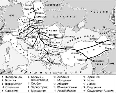 Рис. 37. Международные железнодорожные экспрессы в Западной Европе Западная Европа опережает Центрально-Восточную и по развитию автомобильного транспорта. В этом субрегионе при относительно небольших расстояниях и к тому же в условиях сначала ослабления, а затем и отмены в большинстве стран таможенных барьеров особенно выявились преимущества автомобильного транспорта, который по темпам роста опередил все остальные виды. В основных чертах уже создана международная сеть имеющих общую нумерацию автомагистралей, основу которой составляют автострады (рис. 38). В ФРГ сеть автобанов имеет вид «решетки» с пересекающимися линиями широтного и меридионального направлений, причем практически все они продолжаются за границами этой страны. В Италии преобладают линии меридионального направления, главная из которых – так называемая «автострада Солнца» – связывает Милан с южной оконечностью полуострова, проходя через Болонью, Флоренцию, Рим и Неаполь. Для Франции, как и следовало ожидать, характерна радиальная планировка автодорожной сети. Одна из главных автострад («Юг») связывает Париж с Лионом, Марселем и Ниццей, другая («Восток») – со Страсбургом. Затем они продолжаются соответственно в Италии и ФРГ. Страны Западной Европы достигли также значительно более высокого уровня автомобилизации (рис. 106 в книге I), чем государства Центрально-Восточной Европы, где до недавнего времени развитие автомобильного транспорта заметно отставало, а сооружение современных автострад началось только в Чехословакии и Польше. Поэтому в 1990-х гг. большое внимание развитию автодорожной сети стали уделять именно в странах этого субрегиона, в особенности развитию трансъевропейских сообщений в направлениях Север – Юг и Запад – Восток. В качестве примера можно привести проект сооружения автомагистрали Север – Юг, предназначенной прежде всего для обслуживания туристских потоков (рис. 39). Согласно проекту, принятому еще в 1982 г., эта магистраль начинается в польском порту Гданьск, куда автотуристы из Скандинавии попадают на паромах. Затем она проходит через страны Центрально-Восточной Европы до Афин и Стамбула с ответвлениями к Адриатическому и Черному морям. В Стамбуле по двум мостам через Босфор поток автомашин может попасть и в Турцию. Таким образом, в сооружении этой магистрали общей длиной более 10 тыс. км намечено участие десяти стран. В состав трассы должны войти многие участки существующих дорог, реконструированные в соответствии со стандартами автострады. Однако события последних лет в Центрально-Восточной Европе, включая обстановку в бывшей СФРЮ, по-видимому, значительно отодвинут сроки осуществления этого проекта. В 1990-е гг., в условиях совершенно новой геополитической обстановки в Европе, усиления общеевропейских интеграционных процессов в рамках единого европейского пространства, значительно большее значение приобрел другой проект создания общеевропейской сети автомобильных дорог – EVROVIA, охватывающий всю территорию Европы от Атлантики до Урала. Рассчитанный на 15 лет, он предусматривает превращение в современные автодороги европейского класса 58 тыс. км существующих автомобильных дорог. Интеграционные процессы сказались и на системе внутренних водных путей Европы. Общая их протяженность составляет 100 тыс. км, в том числе судоходны