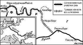 Рис. 39. Проект трансъевропейской автомагистрали Север – Юг Связующим звеном между ними стал канал Майн – Дунай (рис. 40), сооружение которого началось еще в 1962 г. Канал имеет длину 171 км. Из них 107 км приходятся на северный (майнский) склон водораздела и 64 км – на южный (дунайский). Разница высот составляет 243 м и преодолевается при помощи 16 шлюзов (11 на северном и 5 на южном склоне). Участок трассы между городами Бамберг и Нюрнберг был введен в эксплуатацию в 1972 г., а полностью канал был завершен в 1992 г. По каналу могут проходить самоходные суда грузоподъемностью 1350 т, длиной 80 м, шириной 9,5 м и с осадкой 2,5 м. После увеличения возможной осадки до 2,7 м он сможет пропускать суда грузоподъемностью 1500 т.