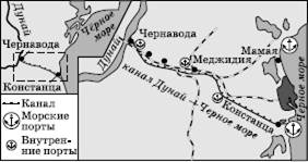 Рис. 40. Водный путь Рейн – Майн – Дунай Отныне обе главные речные магистрали зарубежной Европы – Рейн (грузооборот свыше 300 млн т в год) и Дунай (свыше 100млнт) – соединены между собой и образуют единый водный путь протяженностью 3,5 тыс. км от Роттердама до Сулины в устье Дуная.[19] Моторное судно грузоподъемностью 1350 т проходит это расстояние за 11 дней, а в обратном направлении, против течения, – за 17. Впрочем, такой сквозной маршрут может быть важен только для туристских круизов и части грузов, тогда как основные их потоки ограничиваются отдельными участками этого водного пути. В связи с Дунайским судоходством важно упомянуть и о том, что в Румынии в 1984 г. было завершено сооружение давно запроектированного канала Дунай – Черное море (рис. 41). Этот канал имеет протяженность 64 км, ширину 70—120 м и глубину 7 м и может пропускать суда дедвейтом 7000 т, сокращая путь до Черного моря (по сравнению с путем через дельту Дуная) на 240 км, а до Констанцы – на 400 км. Максимальная пропускная способность канала – 75 млн т грузов в год. После соединения Рейна с Дунаем в печати стал обсуждаться проект Большого Европейского Кольца, которое позволило бы осуществлять перевозки грузов и пассажиров по единому замкнутому водному маршруту: Санкт-Петербург – Волго-Балт – Волга – Волго-Дон – Азовское море – Черное море – Дунай – Майн – Рейн – Северное море – Балтийское море – Санкт-Петербург. Беспрерывные перевозки грузов по нему могут быть обеспечены при условии эксплуатации судов типа «река – море».