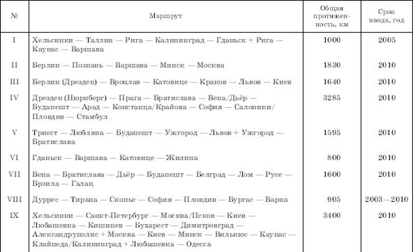 Рис. 41. Канал Дунай – Черное море в Румынии Добавим, что уже очень давно существуют проекты водных путей, соединяющих Дунай с Одером (расстояние между Щецином и Сулиной составляет 2800 км) и с Эльбой (между Гамбургом и Сулиной 3000 км). Разработаны также проекты водных путей, соединяющих Дунай с Адриатическим морем по Саве и с Эгейским морем по Мораве и Вардару. То же можно сказать о проекте соединения Рейна с Роной и создания единого водного пути от Роттердама до Марселя. Однако их осуществление требует таких огромных капиталовложений, которых заинтересованные государства пока изыскать не смогли. К тому же возникает немало дополнительных пограничных, таможенных, да и более широких общеполитических проблем. Однако при всем значении перечисленных проектов в последнее время особенно большое внимание привлекают проекты осуществления так называемых транспортных коридоров между Западом и Востоком Европы. Именно этим коридорам предстоит сыграть главную роль в процессах общеевропейской интеграции, в создании панъевропейской транспортной системы. Решение о таких коридорах было принято в 1994 г. на Второй общеевропейской конференции по транспорту, где их наметили девять. Они должны охватить все виды транспорта на территории 24 стран. Общая их протяженность составит почти 17 тыс. км, а сроки сдачи в эксплуатацию намечены на период до 2010 г. (табл. 15, рис. 42). Каждый транспортный коридор должен представлять собой полимагистраль, т. е. объединять параллельно идущие линии автомобильных и железных дорог, а иногда и трубопроводов, водных путей и ЛЭП. Таблица 15 ТРАНСПОРТНЫЕ КОРИДОРЫ МЕЖДУ ЗАПАДОМ И ВОСТОКОМ ЕВРОПЫ