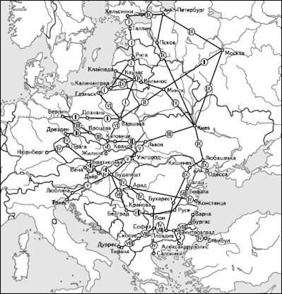 Зарубежная Европа занимает видное место в мировом грузо– и пассажиро-обороте. Ее региональная транспортная система представляет собой сложное переплетение практически всех видов транспортных путей. К ее характерным чертам принято относить: сложность конфигурации, очень высокую густоту сети, большую долю смешанных перевозок, широкое развитие транзитного сообщения. До начала 1990-х гг., когда интеграционные процессы в западной и восточной частях Европы протекали в значительной мере изолированно друг от друга, развитие транспорта также привело к формированию двух почти самостоятельных концентров – западного (капиталистического) и восточного (социалистического), хотя, разумеется, связанных между собой. Но затем, когда возобладали идеи «европейского дома», стали получать развитие и объекты общеевропейской транспортной инфраструктуры. Именно такие объекты – автомобильные и железнодорожные магистрали, судоходные реки и каналы, трубопроводы, морские порты и международные аэропорты – составляют ныне костяк общеевропейской транспортной инфраструктуры, определяя ее конфигурацию. Именно к ним привлечено внимание не только отдельных стран, но и международных общеэкономических и транспортных организаций, в особенности в рамках ООН и Европейского союза. В результате в этой важной сфере хозяйства были разработаны и частично уже начали осуществляться многие крупномасштабные проекты. Интеграционные процессы оказали большое влияние на развитие железнодорожного транспорта Европы. До начала 1990-х гг. они сказывались преимущественно на Западной Европе, где на многих направлениях начали действовать международные железнодорожные экспрессы (рис. 37). Рисунок 37 схематически показывает направления движения 20 таких экспрессов. Добавим также, что каждый из них имеет свое название: экспресс № 2 Амстердам – Мюнхен именуется «Рембрандт», экспресс № 5 Франкфурт – Париж – «Гёте», экспресс № 8 Гамбург – Милан – «Роланд», экспресс № 14 Амстердам – Париж – «Брабант», экспресс № 20 Базель – Милан – «Готард». K этой схеме нужно добавить еще несколько экспрессов, идущих из Западной Европы в направлении Стамбула; все они обычно имеют в названии приставку «Ориент» («Восток»). Рисунок 37 позволяет определить главные конечные пункты и главные пересадочные транспортные узлы, которых больше всего в ФРГ (Дуйсбург, Кёльн, Франкфурт, Вюрцбург, Ганновер, Нюрнберг, Мюнхен). На большинстве отмеченных на карте направлений интенсивность движения очень велика. Например, по левобережной рейнской магистрали между Кёльном и Кобленцом курсирует до 350 железнодорожных составов, а по правому берегу Рейна – около 300 составов в сутки. С начала 1990-х гг. реконструкция железнодорожной сети идет по двум главным направлениям. Это, во-первых, уже охарактеризованное создание высокоскоростных магистралей на главных участках пассажирского движения. И это, во-вторых, объединение железных дорог Западной и Центрально-Восточной Европы. Можно добавить, что на обширной территории последнего субрегиона также исторически сложились довольно существенные различия между северной и южной группами стран. В Польше, Чехословакии и Венгрии железнодорожное строительство велось главным образом еще в XIX в., и для них характерна в целом большая густота сети железных дорог. В Балканских 