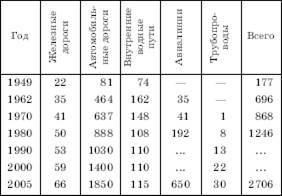 В стране с такой большой территорией, с таким огромным населением и с таким разнообразием природных и социально-экономических условий, как в Китае, роль транспортных связей особенно значительна. Тем не менее при своем образовании в 1949 г. Китайская Народная Республика получила в наследство от старого Китая слаборазвитую транспортную систему. Общая протяженность транспортной сети составляла всего 177 тыс. км. В стране не было ни одного трубопровода, ни одной линии воздушных сообщений. Транспортная сеть отличалась малой пропускной способностью и крайней технической отсталостью, транспортный парк был устаревшим. Все это не могло не тормозить развитие экономики, внутрирайонного, межрайонного, да и международного разделения труда. К тому же между уровнями развития транспорта в приморских и глубинных районах существовал очень большой разрыв. За полвека с небольшим существования КНР в области транспорта произошли радикальные перемены. Приоритетное внимание государства к этой отрасли привело к тому, что количественные показатели, характеризующие большинство ее подотраслей и тем самым как бы определяющие масштабы транспортной системы страны, возросли во много раз (табл. 39, 40). К приведенным в таблицах 39 и 40 сведениям можно добавить и данные о пассажирских перевозках. Так, пассажиро-оборот железных дорог уже достиг 600 млрд пассажиро-км. Воздушный транспорт ежегодно перевозит 120–130 млн пассажиров. Правда, еще отстают автомобильные пассажироперевозки, но и в этой сфере перелом уже начался. Косвенно об этом можно судить по производству автомобилей, которое в 1993 г. вышло на уровень 1 млн, в 2000 г. – 2 млн, в 2002 г. – 3 млн, в 2003 г. – 4 млн, в 2004 г. – 5 млн и в 2006 г. – 7 млн. Таблица 39 РОСТ ПРОТЯЖЕННОСТИ ПУТЕЙ СООБЩЕНИЯ В КИТАЕ, тыс. км