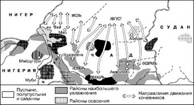 В таких природно-климатических условиях на протяжении столетий сложился и традиционный тип хозяйственной деятельности, основу которого образует кочевое и полукочевое скотоводство. Поголовье скота в Сахели насчитывает десятки миллионов голов. В северной полупустынной ее части это главным образом верблюды, овцы, в южной – крупный рогатый скот, овцы, козы. Во время короткого влажного периода скот пасется в северной части Сахели, в сухой сезон его отгоняют на юг (рис. 162). На юге Сахели распространено также богарное земледелие, сочетающееся со скотоводством. При таком использовании земли до недавнего времени удавалось сохранить относительное экологическое равновесие. Но во второй половине XX в. оно оказалось нарушенным. Некоторые ученые связывают это с наступлением в Сахели очередной засушливой климатической эпохи. Но большинство считают, что такое нарушение экологического равновесия объясняется сугубо антропогенными причинами. Анализ показывает, что среди них можно выделить три главных. В качестве первой причины назовем демографический взрыв, отчетливо проявившийся в Сахели еще в 1960—1970-е гг., когда во всех странах этой зоны среднегодовой прирост населения увеличился до 2,5–3 % в год и даже более. Известно, что при таких темпах прироста население удваивается каждые 23–28 лет. И неудивительно, что в начале 1990-х гг. население десяти стран Сахели достигло 120 млн, а к концу века превысило 160 млн человек. Уже одно это обстоятельство объясняет резкое увеличение «давления» на землю и другие природные ресурсы. В наши дни ни одна из стран Сахельской зоны не обеспечивает продовольствием своих жителей. В качестве второй причины можно назвать быстрый рост распашки земель и особенно – поголовья скота. Это явление – общее для Африки, где поголовье скота увеличилось с 270 млн голов в 1950 г. до 650 млн голов в конце 1990-х гг. Поскольку кормового зерна не хватает, почти весь крупный рогатый скот, а также 230 млн овец и 200 млн коз практически полностью находятся на отгоне и выпасе. Но в наибольшей степени это характерно для Сахели. Обычно в нарушении экологического равновесия в зоне Сахели больше всего обвиняют местных скотоводов. Существует даже выражение: «Кочевник – не столько сын, сколько отец пустыни». Действительно, еще в начале 1980-х гг. общее поголовье скота, который в Сахели служит главным мерилом богатства, примерно в три раза превысило норму, допускаемую емкостью пастбищ. Перевыпас стал приводить к быстрому их вытаптыванию, причем рыхлые песчаные почвы зачастую превращались в легко развеваемые пески. Но значительная часть «вины» лежит и на земледельцах, которые не только стали распахивать земли в южной части Сахели, раньше служившие зимними пастбищами для кочевников, но и начали продвигаться в северную, более засушливую ее часть, где находятся их летние пастбища. В результате между кочевниками и земледельцами развернулась настоящая борьба за источники водоснабжения. Третья причина, которую нужно назвать, – обезлесение. Может быть, по отношению к Сахели, где практически нет лесов, а растут обычно лишь отдельные группы деревьев и кустарников, сам этот термин несколько условен. Но тем большую экологическую опасность представляет сведение и этой небогатой растительности. Ее используют для прикорма скота в сухой сезон. Ее уничтожают из-за в