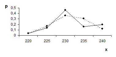 Сравнение графиков наглядно показывает близость выравнивающих частот к наблюдаемым и подтверждает правильность допущения о том, что обследуемый признак распределён нормально.