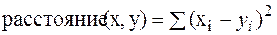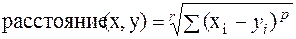 где r и p - параметры, определяемые пользователем. Несколько примеров вычислений могут показать, как "работает" эта мера. Параметр p ответственен за постепенное взвешивание разностей по отдельным координатам, параметр r ответственен за прогрессивное взвешивание больших расстояний между объектами. Если оба параметра r и p, равны двум, то это расстояние совпадает с расстоянием Евклида. Процент несогласия. Эта мера используется в тех случаях, когда данные являются категориальными. Это расстояние вычисляется по формуле: расстояние(x,y) = (Количество x<>yi)/ni