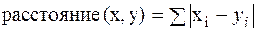 Расстояние городских кварталов (манхэттенское расстояние). Это расстояние является просто средним разностей по координатам. Для этой меры влияние отдельных больших разностей (выбросов) уменьшается (так как они не возводятся в квадрат). Манхэттенское расстояние вычисляется по формуле: