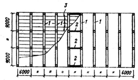 1 – поперечные рамы; 2 – продольные вертикальные связи; 3 – панели перекрытий Рис. 3.1. Конструктивный план многоэтажного каркаса промышленного здания
