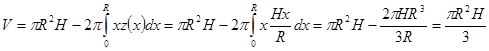 Переходя к дифференциалу и пренебрегая квадратичными членами, имеем Пример. Вычислить объем шара Пример. Вычислить объем прямого кругового конуса, ограниченного поверхностью Вычислим объем, как объем тела вращения, образованного вращением вокруг оси OZ прямоугольного треугольника в плоскости OXZ, катеты которого лежат на оси OZ и прямой z = H, а гипотенуза лежит на прямой Выражая x через z, получим Искомый объем можно посчитать как разность объемов прямого кругового цилиндра