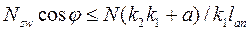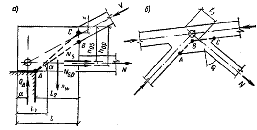 где N — расчетное усилие в растянутом раскосе; φ — угол между поперечными стержнями и направлением растянутого раскоса; n — число поперечных стержней, пересекаемых линией АВС; при этом поперечные стержни, располагаемые на расстоянии меньше 100 мм от точек А и С, а также имеющие в пределах вута заделку менее 30Æ (с учетом загнутых участков поперечной арматуры), в расчет не включаются; l 1 — длина заделки арматуры растянутого раскоса за линией АВС; k 2 — коэффициент, учитывающий особенность работы узла, в котором сходятся растянутый и сжатый подкосы: для узлов верхнего пояса k 2 — 1; для узлов нижнего пояса, если в одном из примыкающих к узлу участке растянутого пояса обеспечивается 2-я категория требований по трещиностойкости и при наличии в узле сжатых стоек или раскосов, имеющих угол наклона к горизонту более 400, k 2 — 1,1; в остальных случаях k 2 — 1,05; а —условное увеличение длины заделки растянутой арматуры с анкерами: а=5Æ — при двух коротышах; а=3Æ — при одном коротыше и петле; а=2Æ — при высаженной головке; l an — заделка арматуры растянутого раскоса, обеспечивающая полное ее использование по прочности при тяжелом бетоне класса C25/30 и выше и арматуре класса S400 l an =35Æ; k 1=σs/fs σs —напряжение в арматуре растянутого раскоса от расчетной нагрузки.
