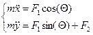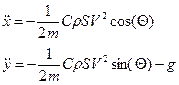 где C - коэффициент сопротивления; ρ - плотность воздуха; S - поперечное сечение снаряда; 2) сила гравитации F 2= - mg, (3.3) где g - ускорение свободного падения. Чтобы записать уравнение (3.1) в переменных x и y, заметим, что сила сопротивления F 1действует вдоль оси снаряда, а сила гравитации F 2 только в вертикальном направлении. Поэтому уравнение (3.1) можно записать покоординатно следующим образом: